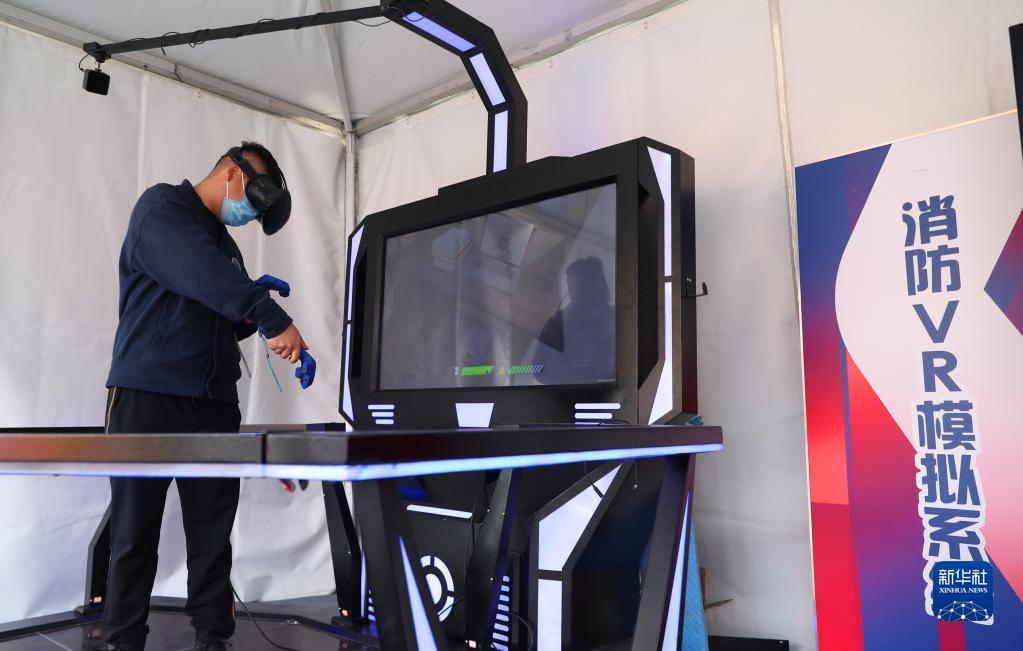 11月15日,在虹口區消防救援支隊舉行的宣傳活動中,社區居民通過消防VR模擬系統體驗排除火災隱患的游戲。
