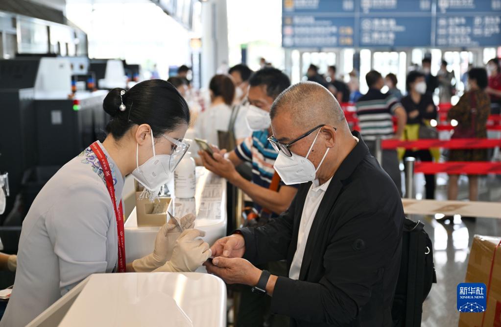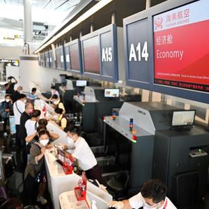 11月16日,準(zhǔn)備乘坐海航班機(jī)前往香港的旅客在海口美蘭國(guó)際機(jī)場(chǎng)辦理登機(jī)手續(xù)。