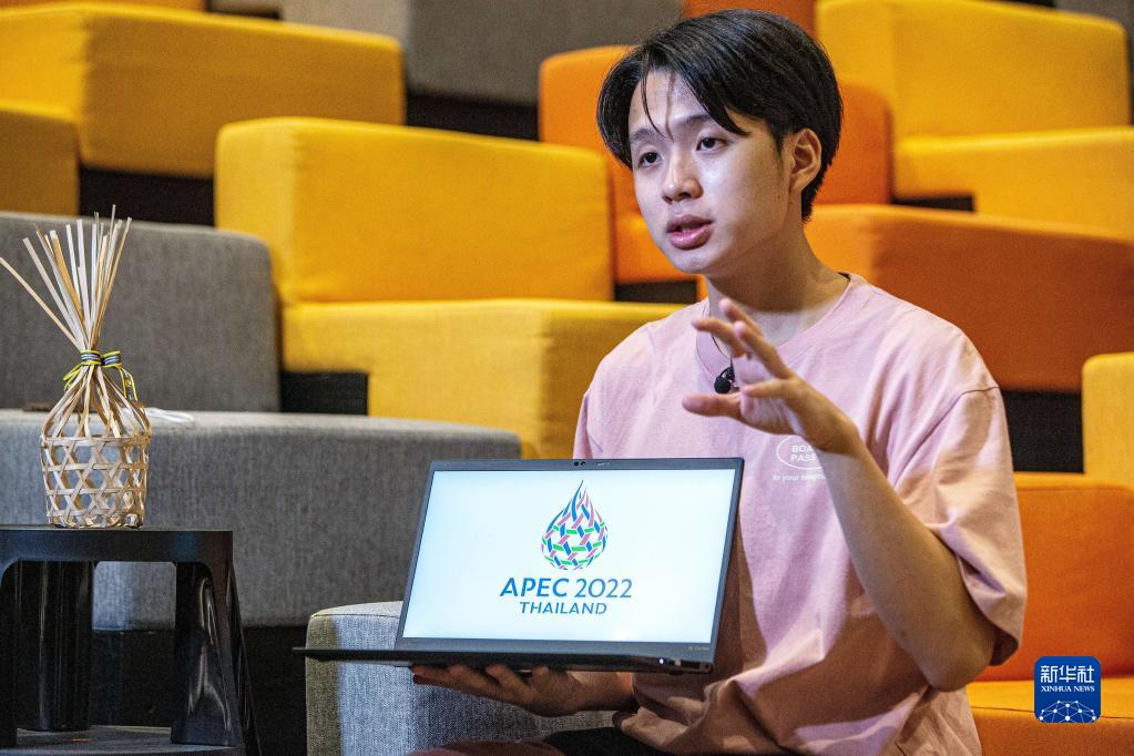 11月5日,在泰國曼谷朱拉隆功大學,會徽設計者查瓦農·翁特拉庫容介紹自己的設計理念。