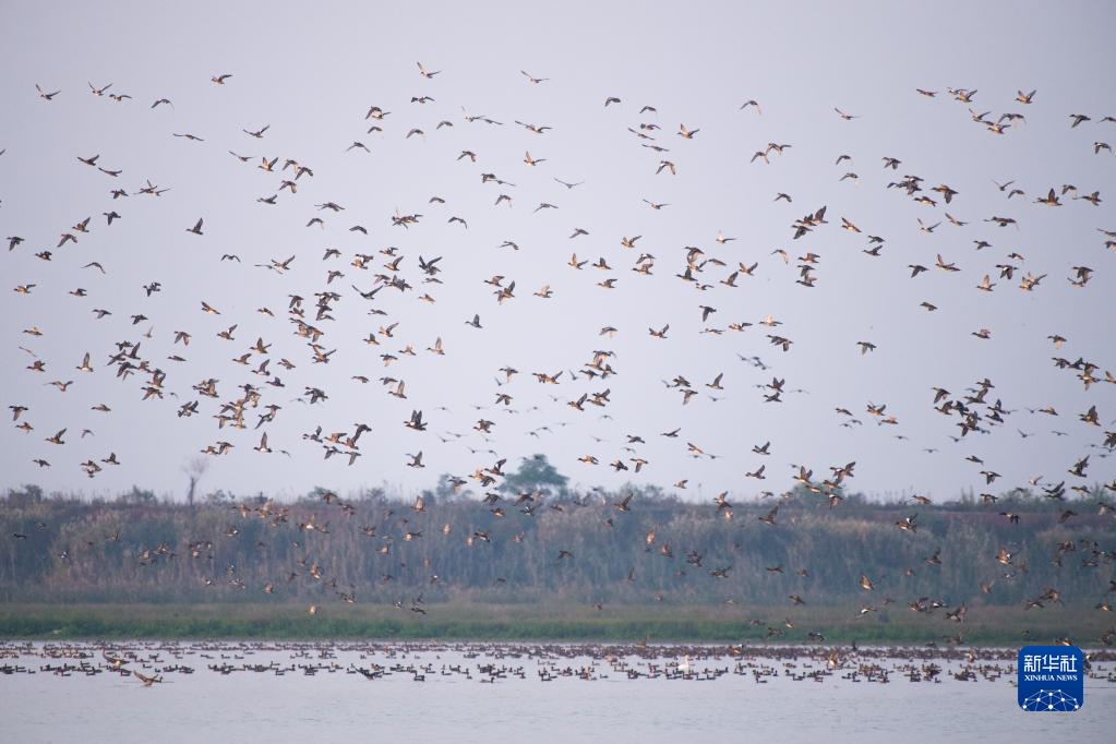 11月10日,成群的羅紋鴨在湖南西洞庭湖國家級自然保護區低飛。 新華社記者陳思汗攝