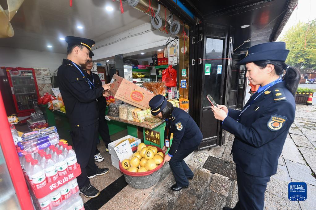 11月17日,湖州市南潯區(qū)南潯鎮(zhèn)綜合行政執(zhí)法隊的市場監(jiān)管工作人員和行政執(zhí)法工作人員在南潯古鎮(zhèn)景區(qū)的商業(yè)街上進(jìn)行“綜合查一次”檢查。