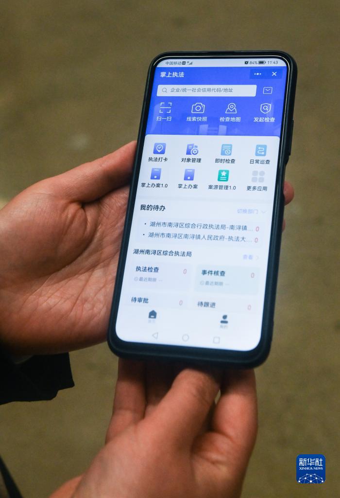 11月17日,湖州市南潯區南潯鎮綜合行政執法隊工作人員展示“掌上執法”數字監管平臺。