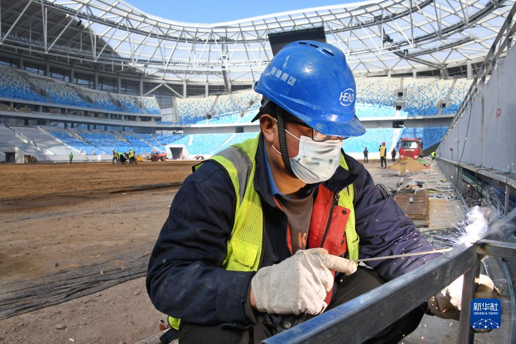 青島青春足球內(nèi)場(chǎng),工人在進(jìn)行焊接作業(yè)(11月16日攝)。