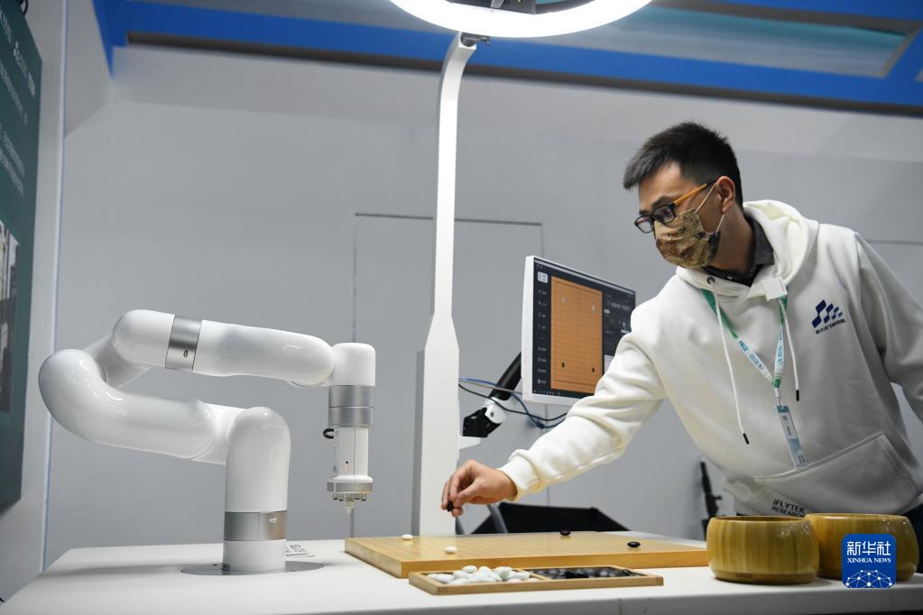 11月17日,工作人員與一款面向圍棋教學的智能機器人互動。