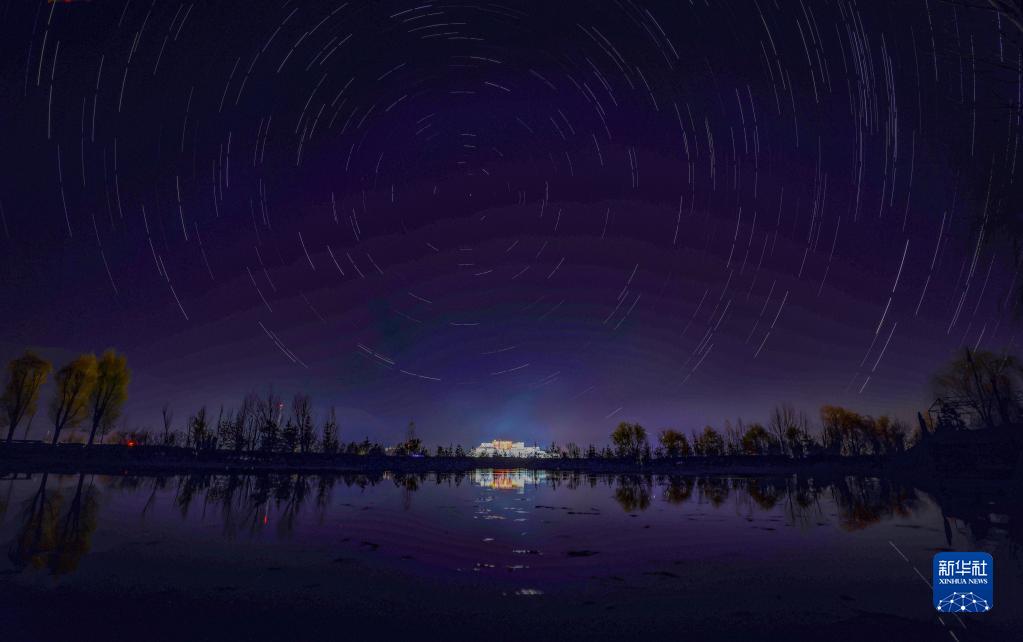 這是在拉薩市南山公園拍攝的以布達拉宮為前景的星軌照片(合成照片,11月15日攝)。