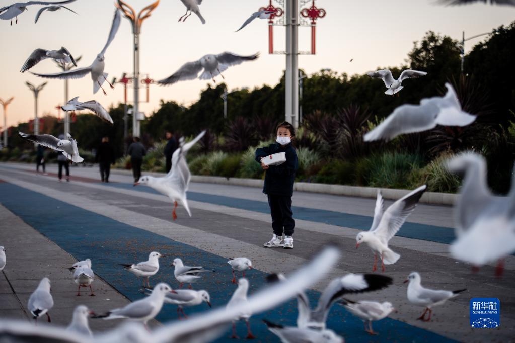 11月17日,小朋友在海埂大壩投喂紅嘴鷗。
