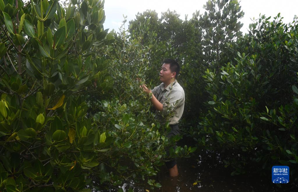海南東寨港國家級自然保護區(qū)林業(yè)工程師馮爾輝在保護區(qū)內的灘涂上查看紅樹林(2019年12月18日攝)。