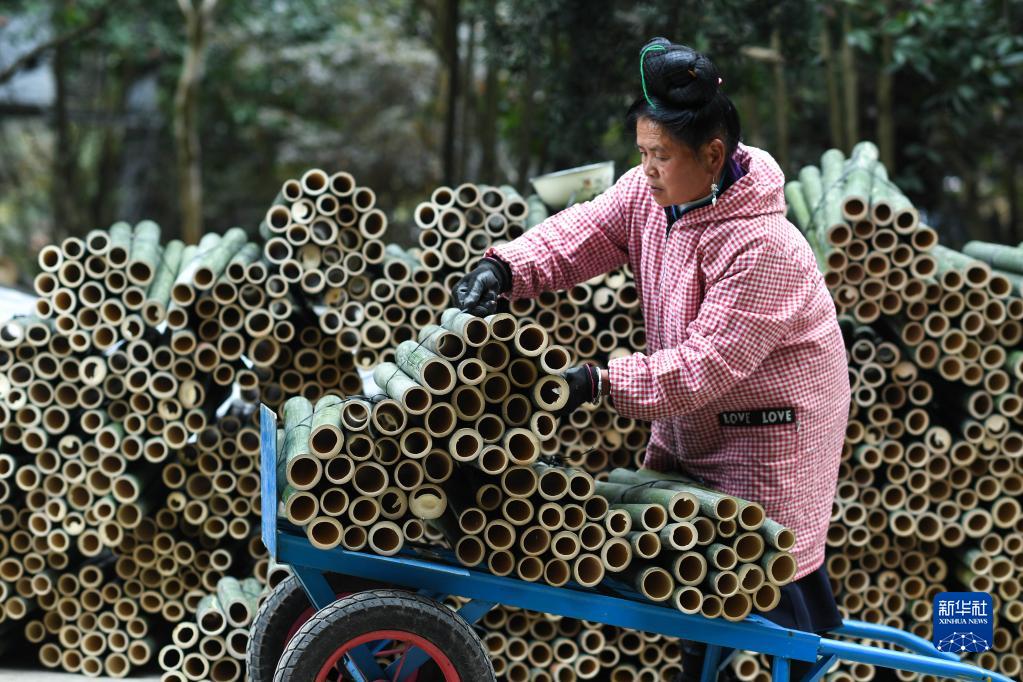 11月17日,在貴州省丹寨縣龍泉鎮卡拉村,村民在搬運用于制作竹編鳥籠的竹子。