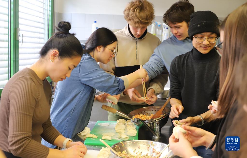 11月17日,在斯洛文尼亞采列市,孔子課堂中國(guó)佳肴工作坊的師生一起包餃子。