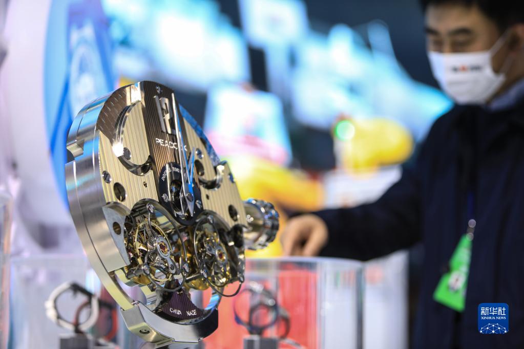 11月18日,參觀者在洽談會期間舉行的“綠色智造產業產品展”上了解展出的機械手表。