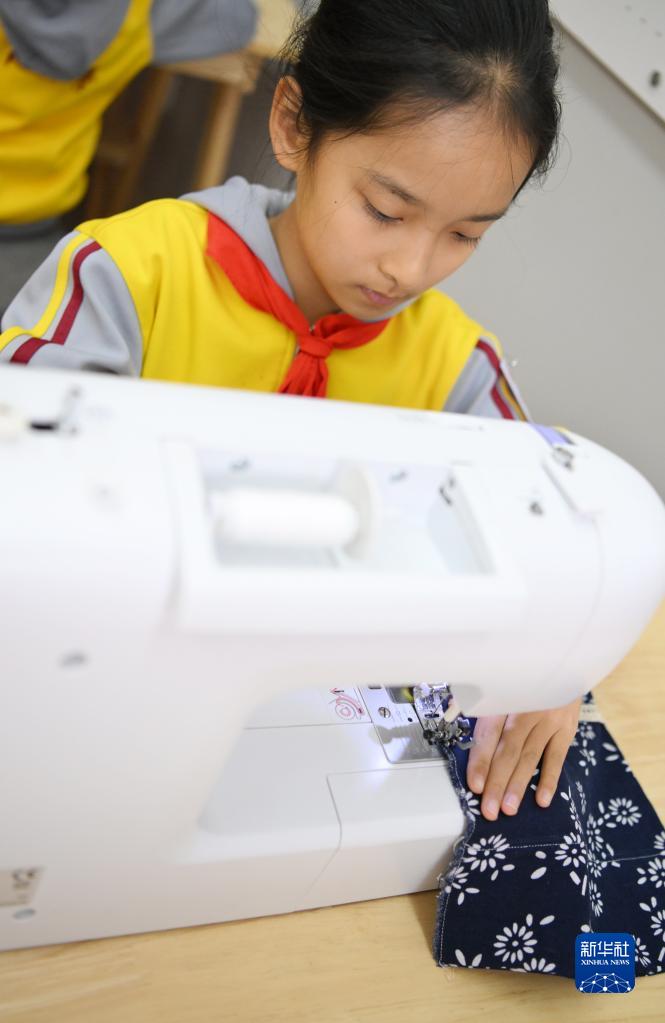 11月17日,天津市和平區中心小學的學生在學習使用縫紉機。