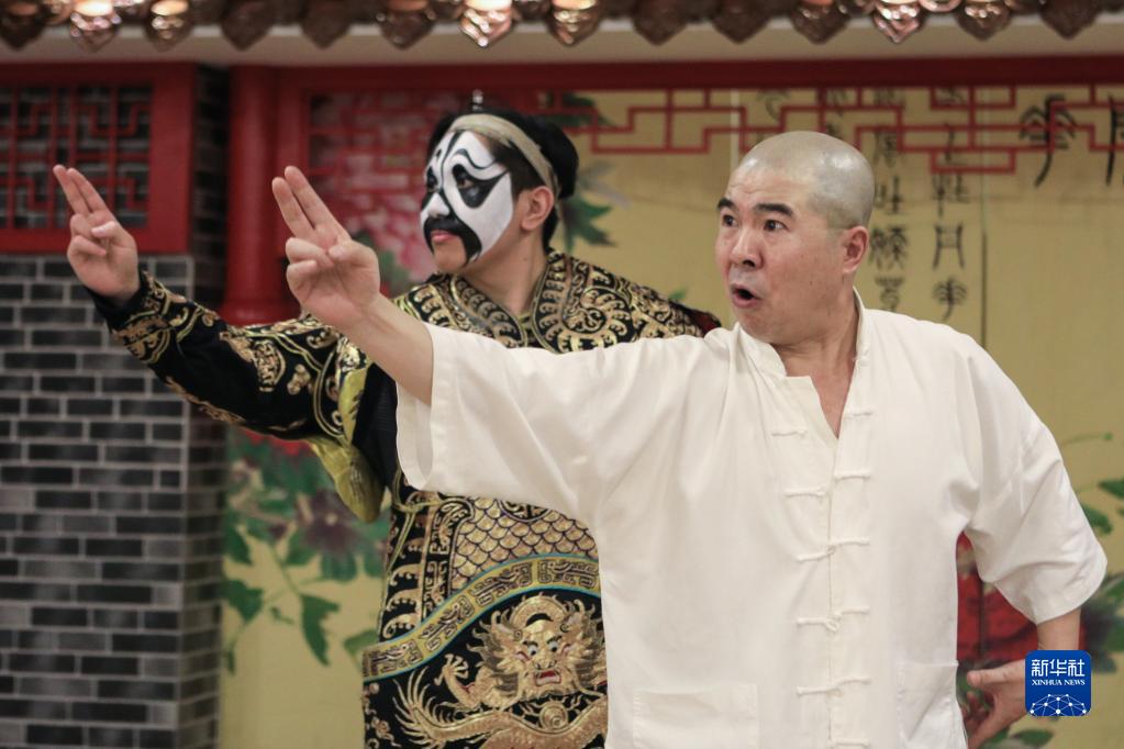 11月14日,沈陽京劇院老師劉大強(右)指導李文龍學習京劇《霸王別姬》。