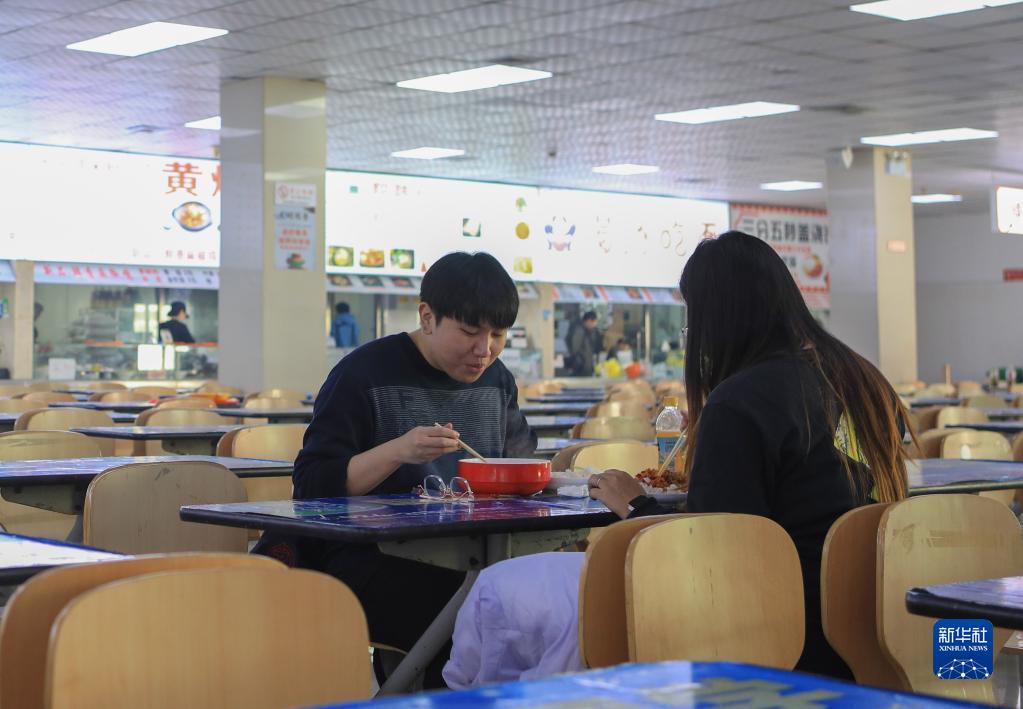11月16日,李文龍(左)和同學(xué)明亮在學(xué)校食堂吃午飯。