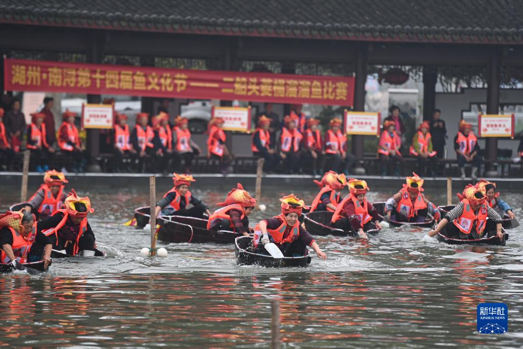11月18日,和孚鎮荻港村村民在進行劃菱桶趣味比賽。