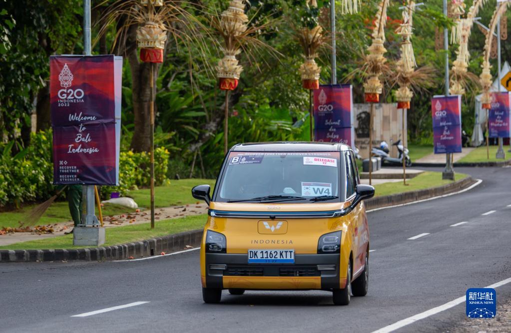 11月12日,二十國集團領導人第十七次峰會官方用車五菱新能源汽車Air ev行駛在印度尼西亞巴厘島的道路上。