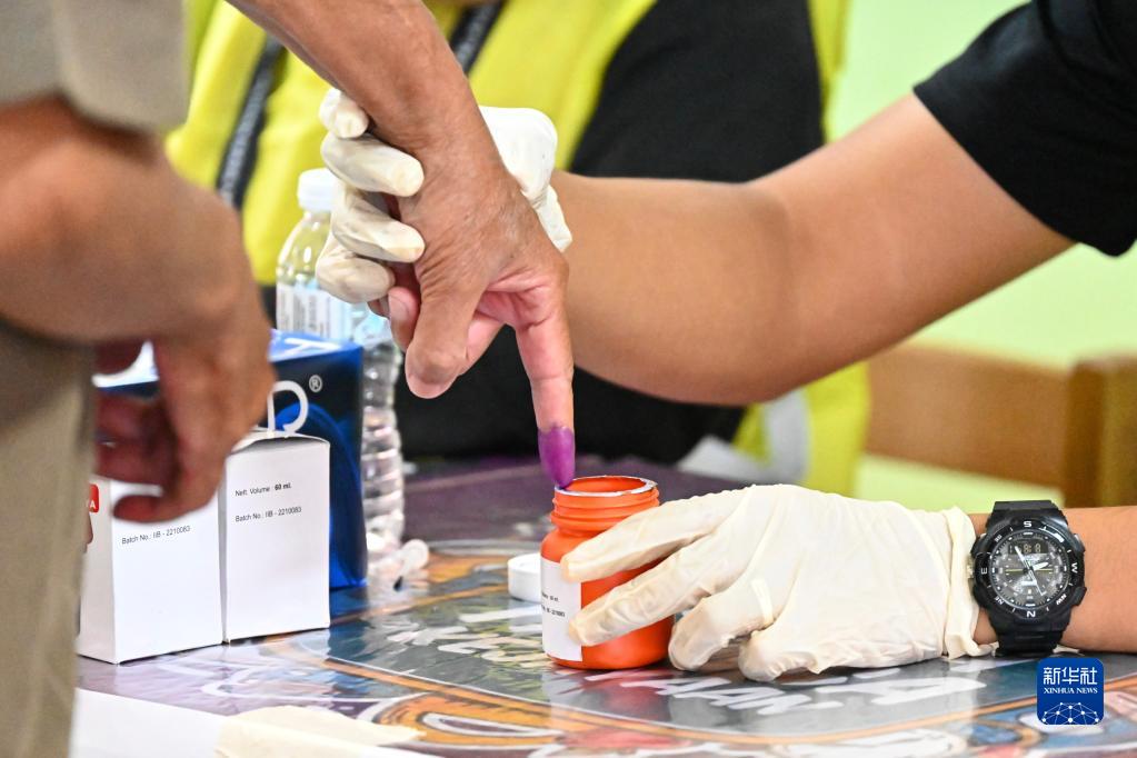 11月19日,在馬來西亞彭亨州貝拉的一處投票站,工作人員幫助選民將手指蘸上墨水。