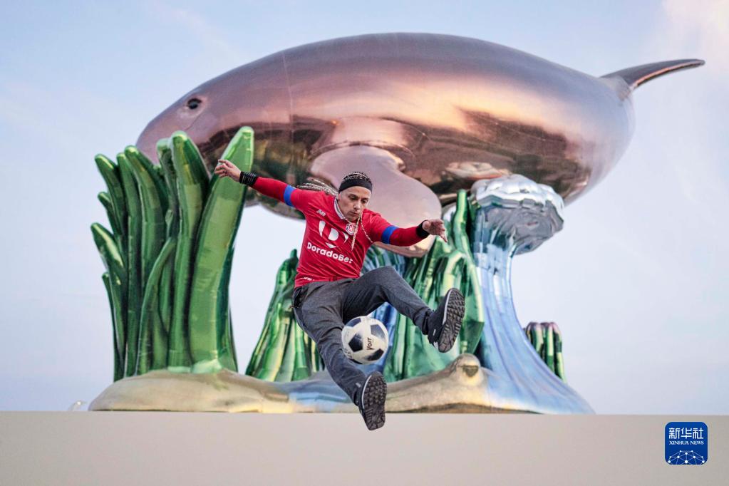 11月18日,來自哥斯達黎加的球迷基卡在一座公園內的雕塑前表演街頭足球。