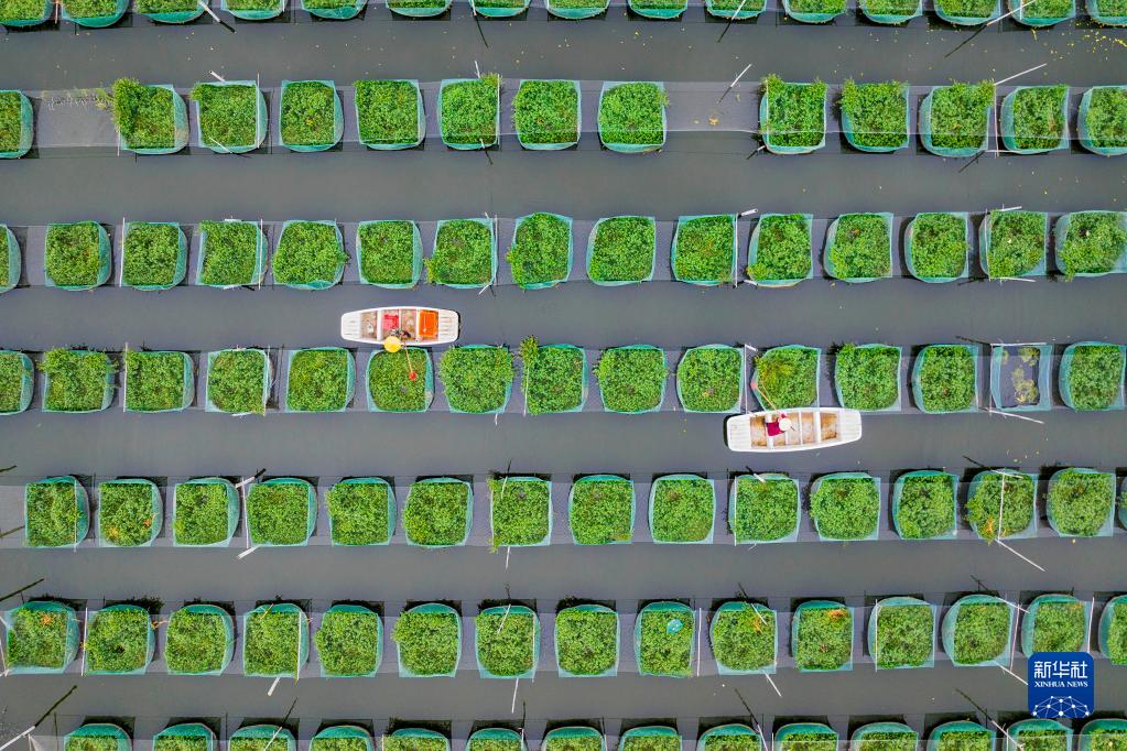 11月12日,湖北省孝感市云夢縣開發(fā)區(qū)和平村村民在池塘中喂養(yǎng)黃鱔(無人機照片)。