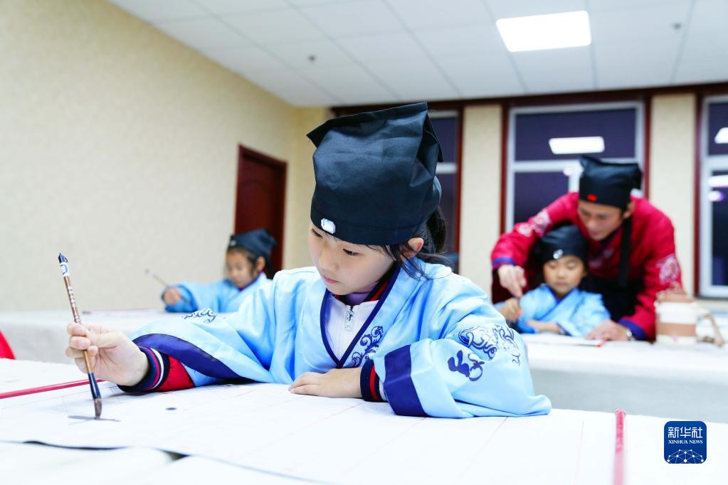 11月19日,在桓臺縣果里鎮伊家村鄉村“復興少年宮”,孩子們在練習書法。