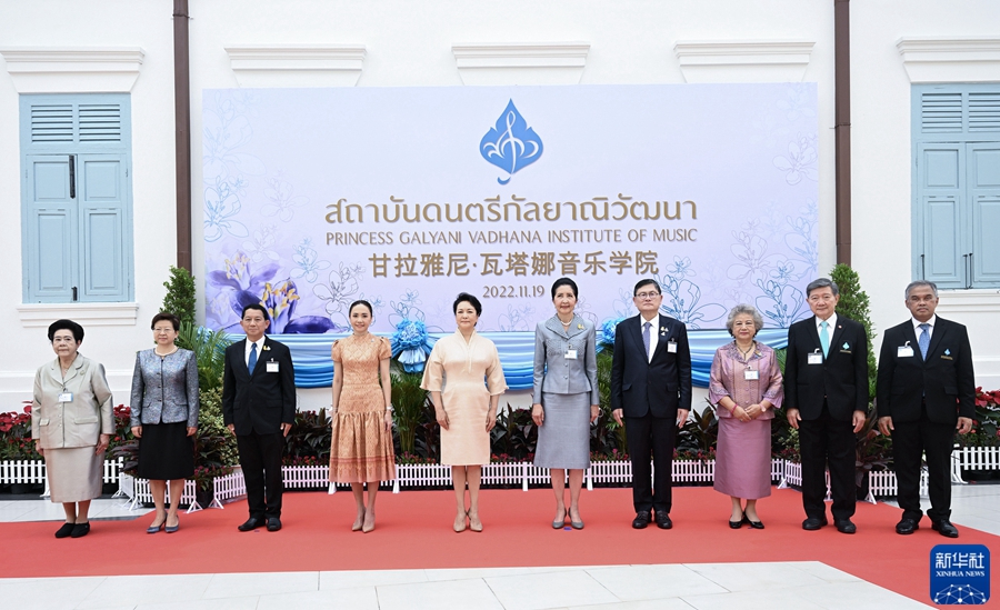 當?shù)貢r間11月19日上午,國家主席習近平夫人彭麗媛在泰國總理夫人娜拉蓬陪同下參觀甘拉雅尼音樂學院。這是彭麗媛與娜拉蓬等合影。
