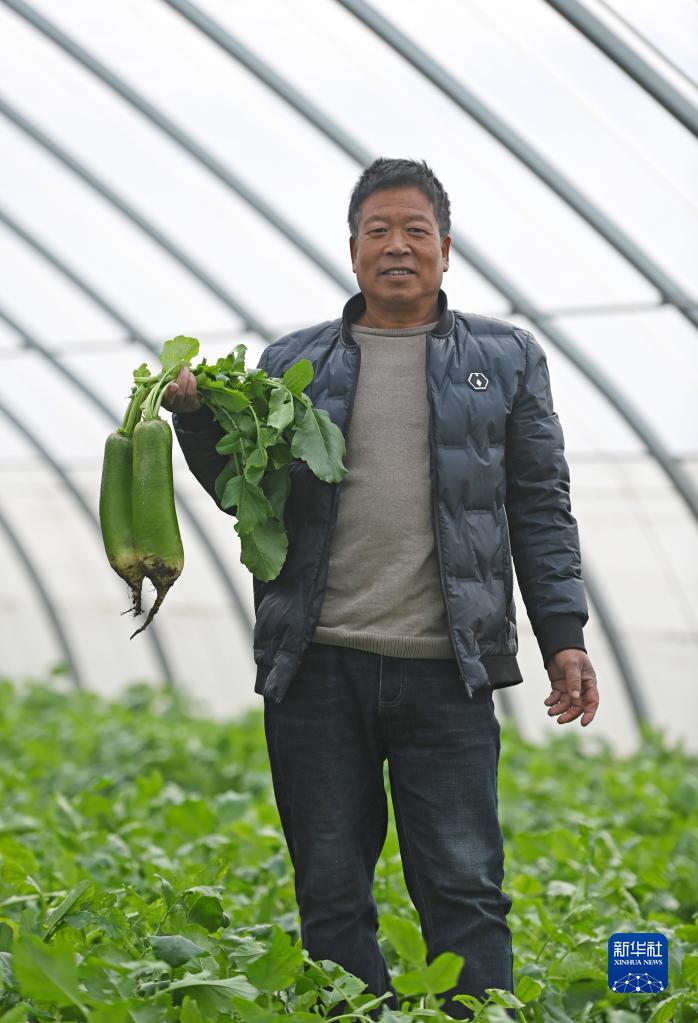 在天津市西青區辛口鎮種植沙窩蘿卜的大棚內,農民展示剛剛收獲的蘿卜(11月18日攝)。
