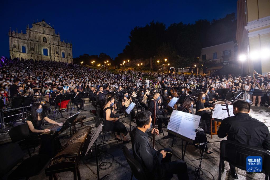 當日,由澳門文化局主辦的“樂韻悠揚大三巴”活動在大三巴牌坊舉行,澳門中樂團帶來《萬水千山總是情》《青花瓷》等曲目,吸引市民及旅客在夜空下駐足欣賞。