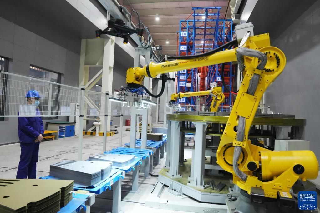 11月17日,在哈電集團哈爾濱電機廠有限責任公司的數字化智能示范車間,工人在觀察機械臂作業。