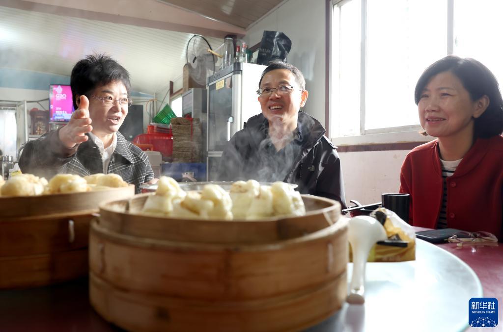11月14日,《大船干絲》文章作者葉慧蓮(左)在泰州市海陵區(qū)華港鎮(zhèn)一家大船干絲早茶店向慕名而來的兩位客人介紹該店的一些特色小吃。葉慧蓮吃了老家港口的早茶后,寫了一篇《大船干絲》的散文,文章見報后,流傳甚廣,眾多城里人“按文索驥”開車到鄉(xiāng)下的這家早茶店來品嘗。