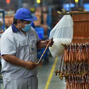 11月8日,在位于泰國羅勇府的泰中羅勇工業園,工人在盾安金屬(泰國)有限公司生產線上工作。