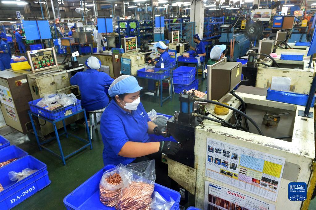 11月8日,在位于泰國羅勇府的泰中羅勇工業園,工人在盾安金屬(泰國)有限公司生產線上工作。