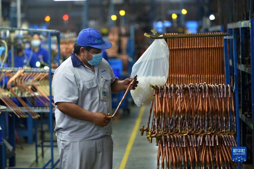11月8日,在位于泰國羅勇府的泰中羅勇工業園,泰國工程師那塔武在盾安金屬(泰國)有限公司生產線上工作。