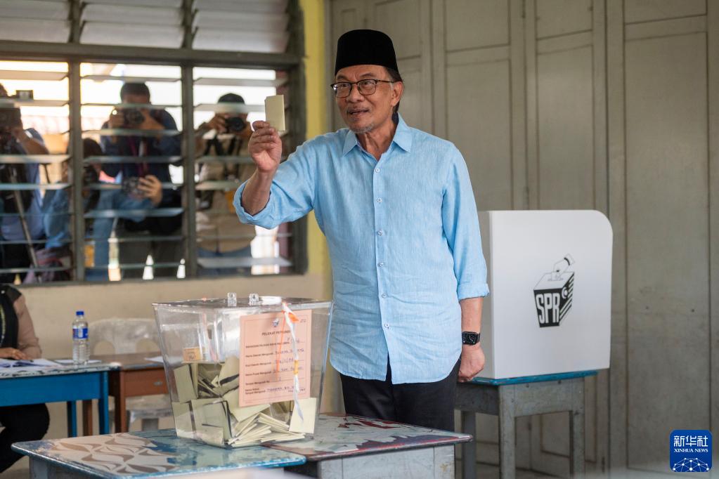 11月19日,在馬來西亞檳榔嶼州一處投票站,希望聯盟領袖安瓦爾展示選票。