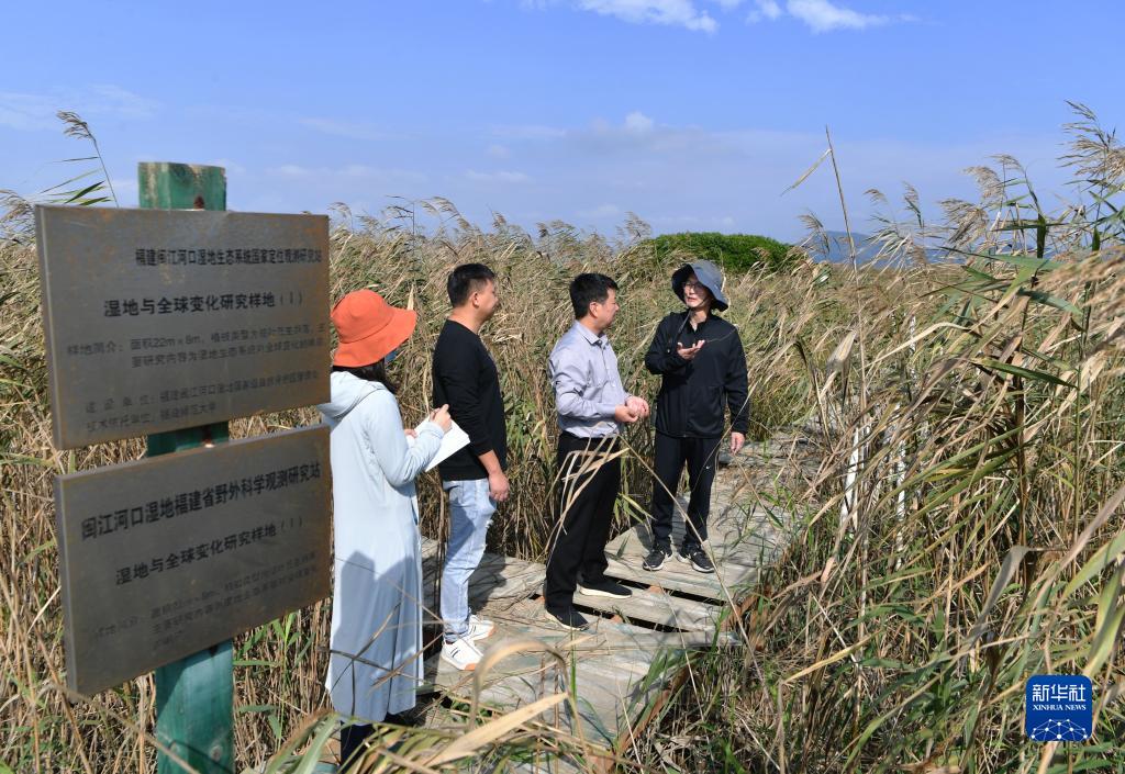 張潮巨(右一)和同事在閩江河口濕地核心區(qū)域觀測濕地植被的生長狀況(11月19日攝)。