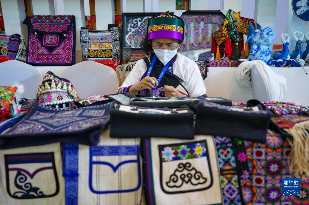 11月20日,一名彝繡傳承人在南博會旅游文化館內(nèi)進行刺繡展示。