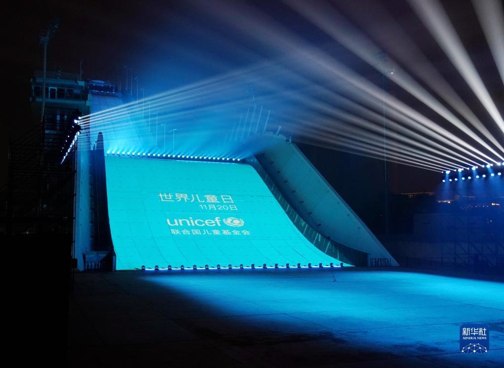 11月20日,北京首鋼滑雪大跳臺為世界兒童日亮燈。