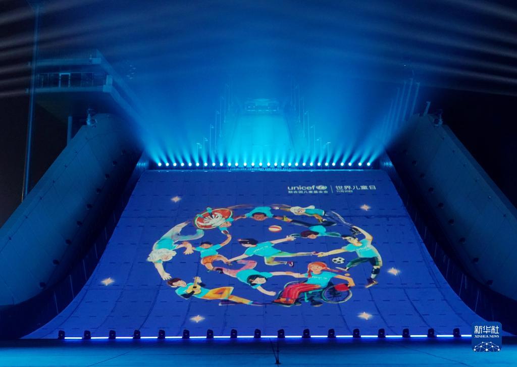 11月20日,北京首鋼滑雪大跳臺為世界兒童日亮燈。