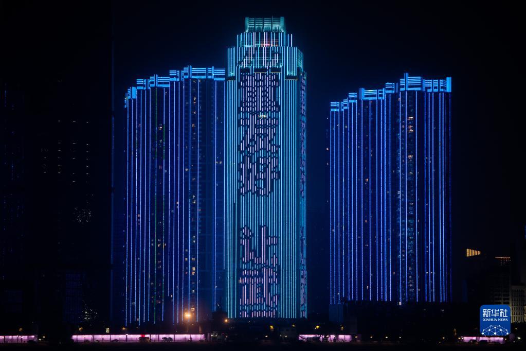 11月20日,湖北武漢世紀中心為世界兒童日亮燈。