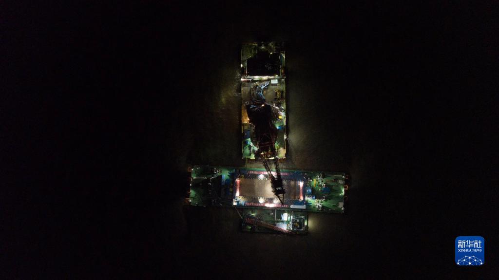 11月20日拍攝的長江口二號古船整體打撈出水施工現場(無人機照片)。