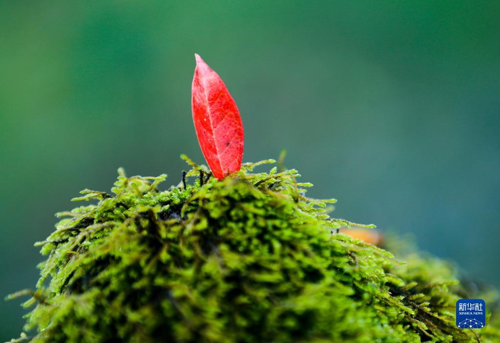 11月16日,在貴州省貴陽市息烽縣,紅葉落在苔蘚上。