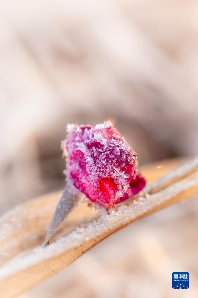 11月16日,在山東省淄博市高青縣,掉落的花瓣沾滿冰霜。