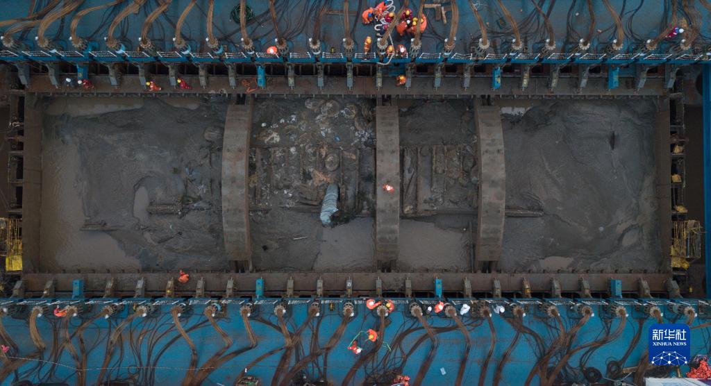 采用世界首創(chuàng)的“弧形梁非接觸文物整體遷移技術(shù)”, 我國迄今水下考古發(fā)現(xiàn)的體量最大的木質(zhì)沉船——長江口二號古船21日在長江口水域成功實(shí)施整體打撈。隨著打撈進(jìn)展有序推進(jìn),21日清晨,長江口二號古船船體已局部露出水面,初露真容。