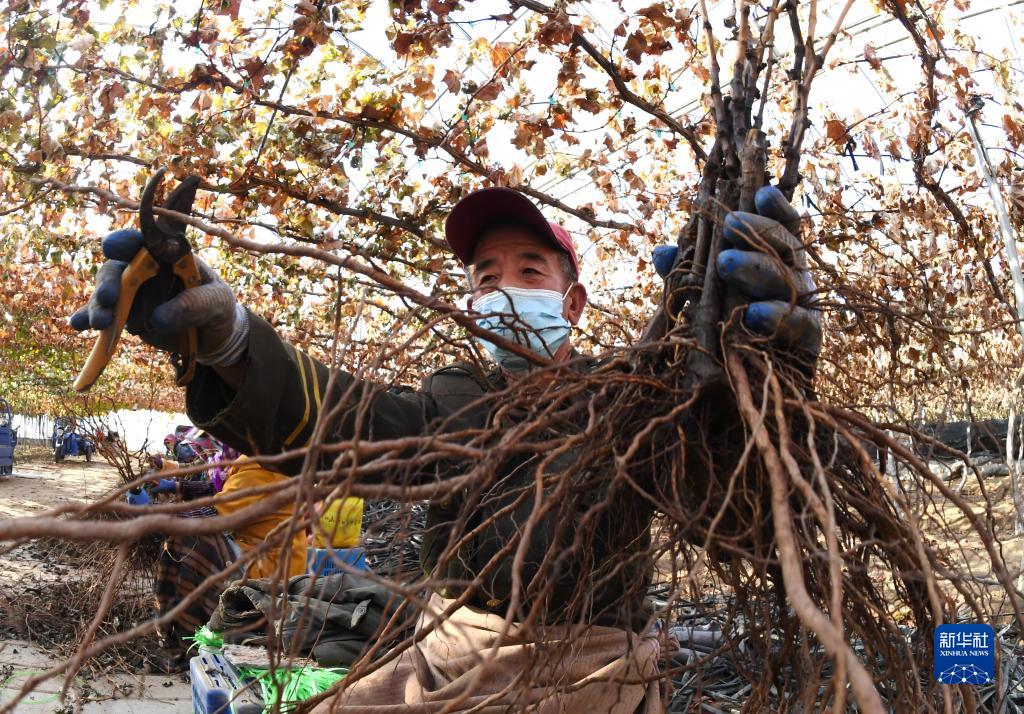 11月21日,農民在河北省張家口市懷來縣豐禾葡萄園里修剪葡萄幼苗。