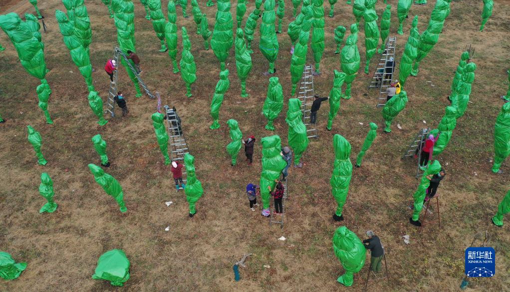 11月21日,在河北省遵化市劉備寨鄉,農民在苗木培育基地包裹景觀樹木御寒防凍(無人機照片)。