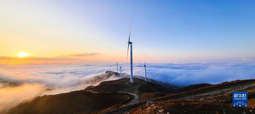 11月20日,在湖南省桂陽縣,風(fēng)力發(fā)電機與云海景觀相互映襯。