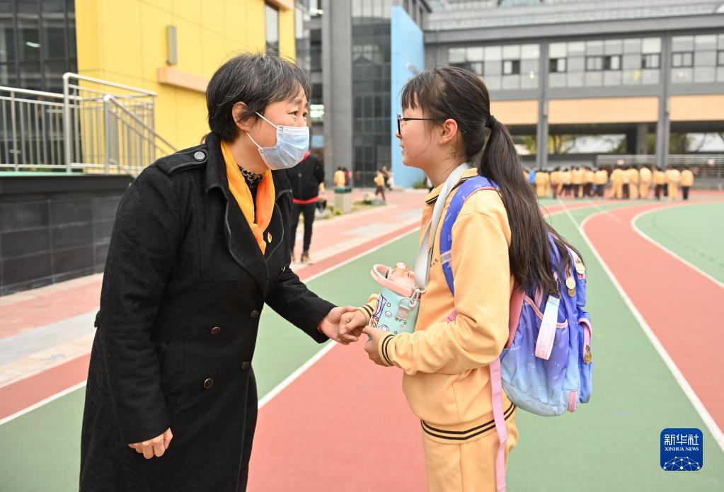 11月18日,在北京第二實驗小學(xué),蘆詠莉與學(xué)生握手交流。