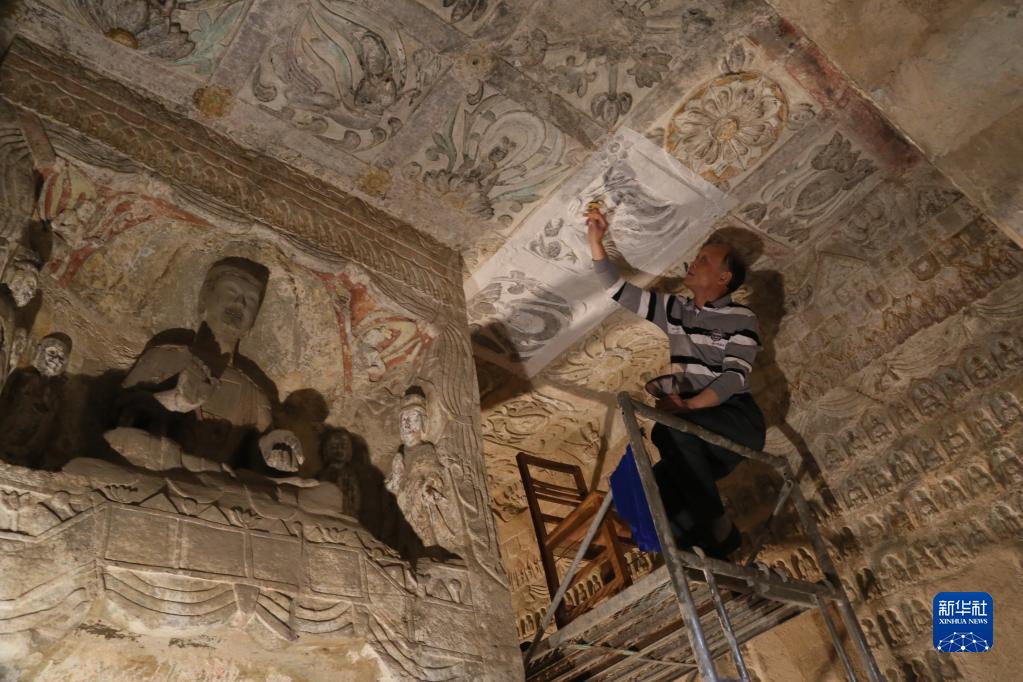 李仁清在鞏義石窟寺進行拓印(資料照片)。