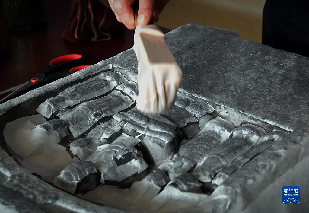 上紙、噴濕、剪紙、砸刷、晾干、撲墨、粘接、修復……一系列流程下來,立體石雕磚上的雕像就纖毫畢現地展露在平面拓片之上,59歲的李仁清拿起拓片仔細地檢查著每一處細節。
