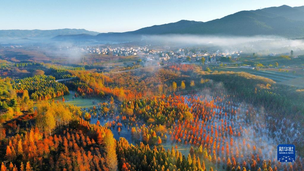 近日,云南省昆明市盤龍區滇源街道甸尾村水杉濕地的水杉林色彩艷麗,景色如畫。