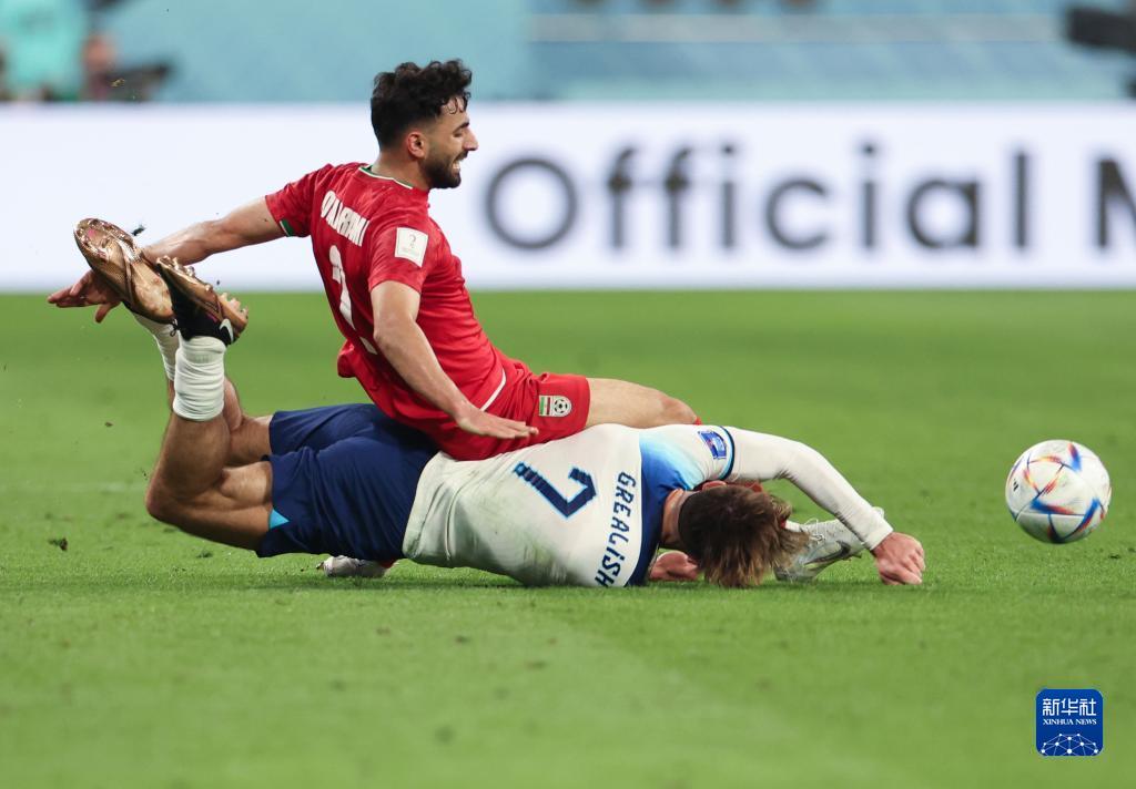 11月21日,伊朗隊(duì)球員穆哈拉米(上)與英格蘭隊(duì)球員格拉利什拼搶。