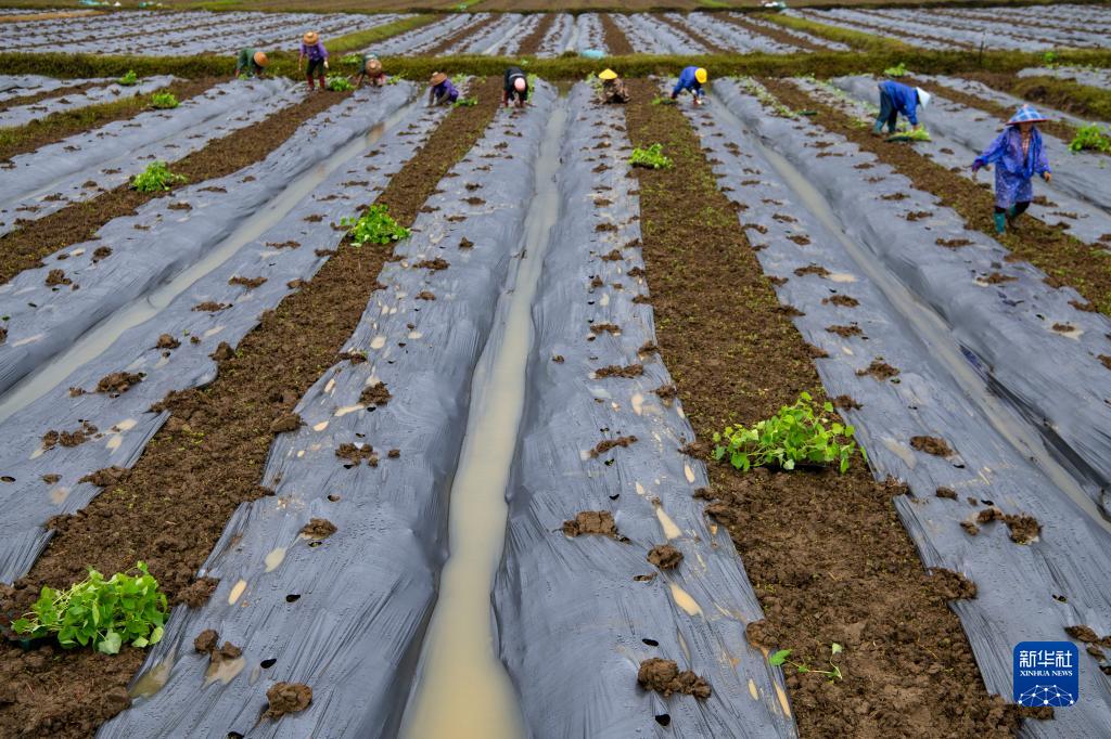 11月22日,海南省瓊海市嘉積鎮農民冒雨種植冬瓜。